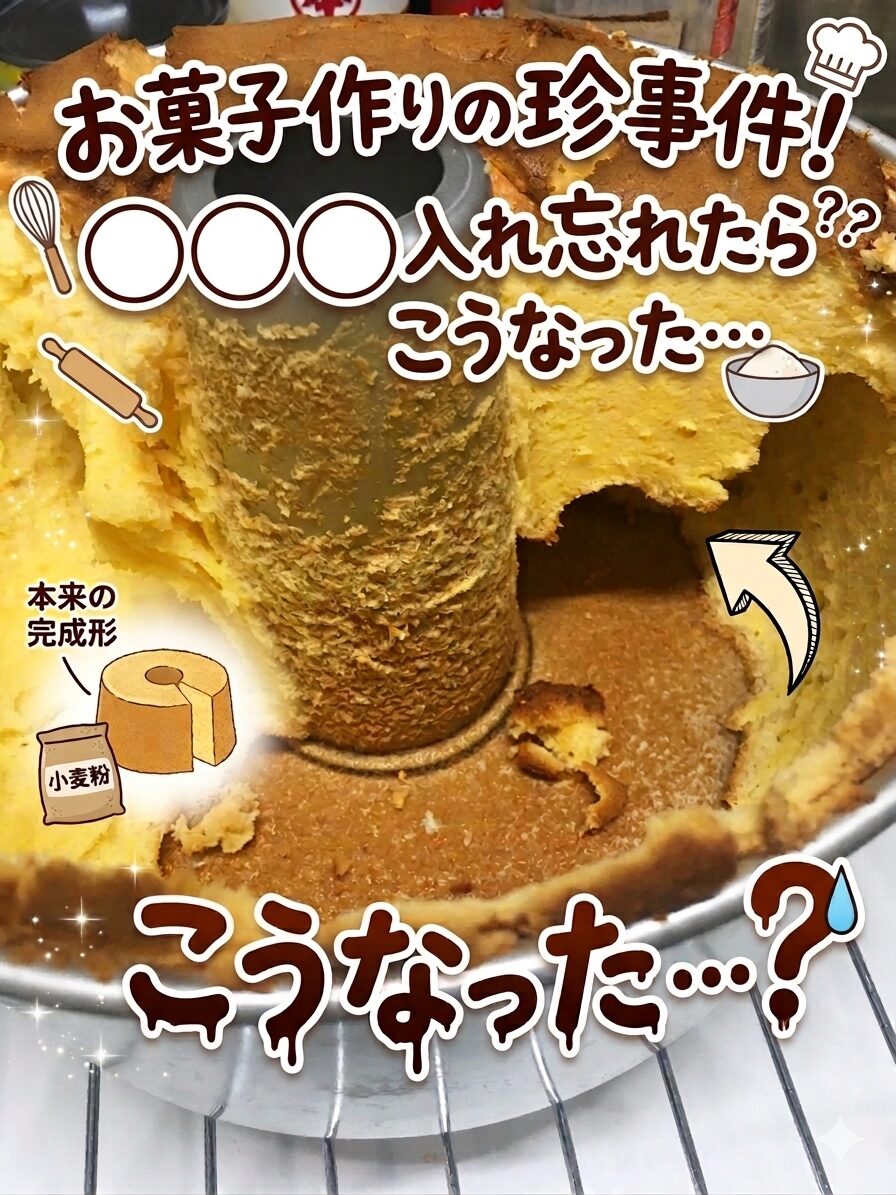 シフォンケーキに小麦粉を入れ忘れたらこうなった…!お菓子作りの珍事件と失敗リカバリー術